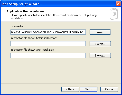 - Choisissez le texte de la licence à afficher au cours de l'installation, et les fichiers des informations à afficher au lancement et à la fin du programme d'installation. Par exemple, le fichier COPYING.TXT de la licence GNU General Public License a été choisi ici comme licence.